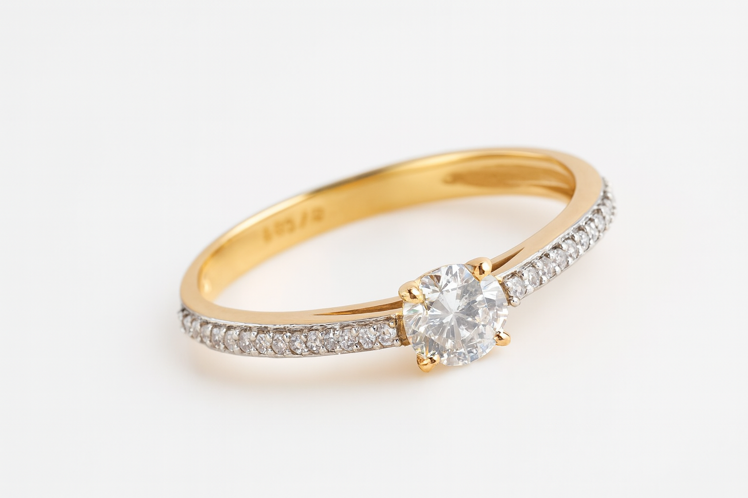Anel solitário em ouro 18k com pedras laterais zircônias.