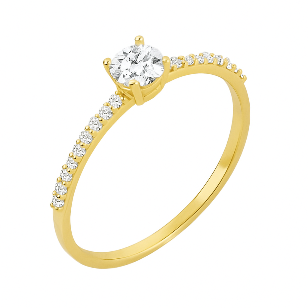Anel solitário em ouro 18k com zircônias laterais.