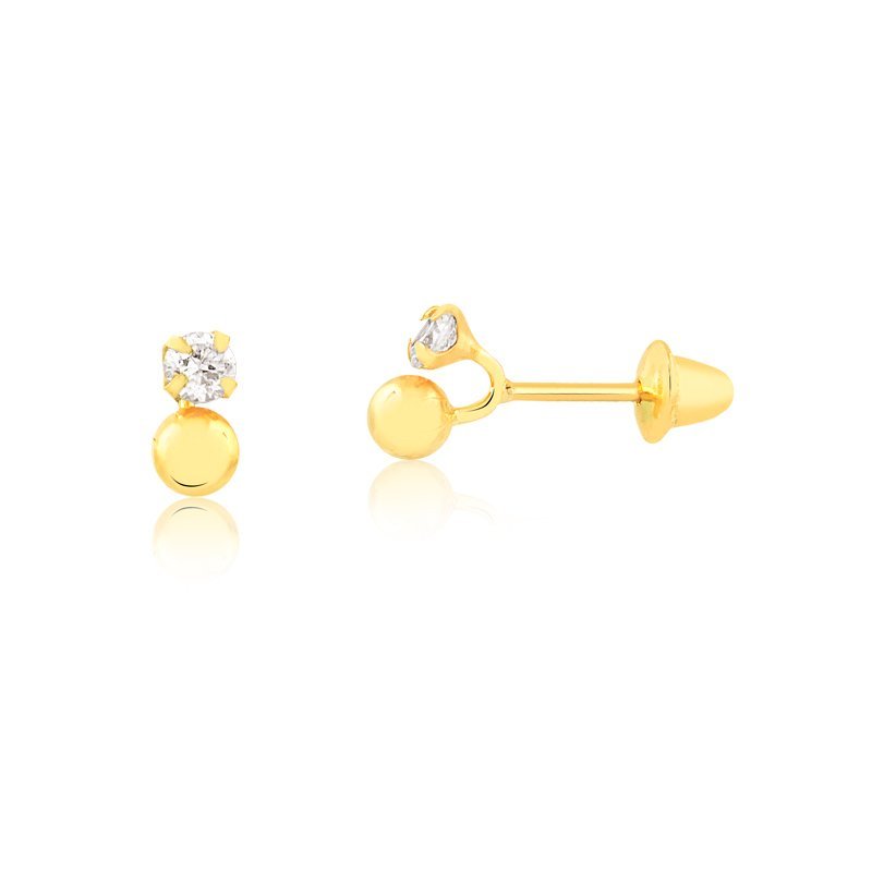 Brinco e bola em ouro 18k e pedra redonda de zircônia.