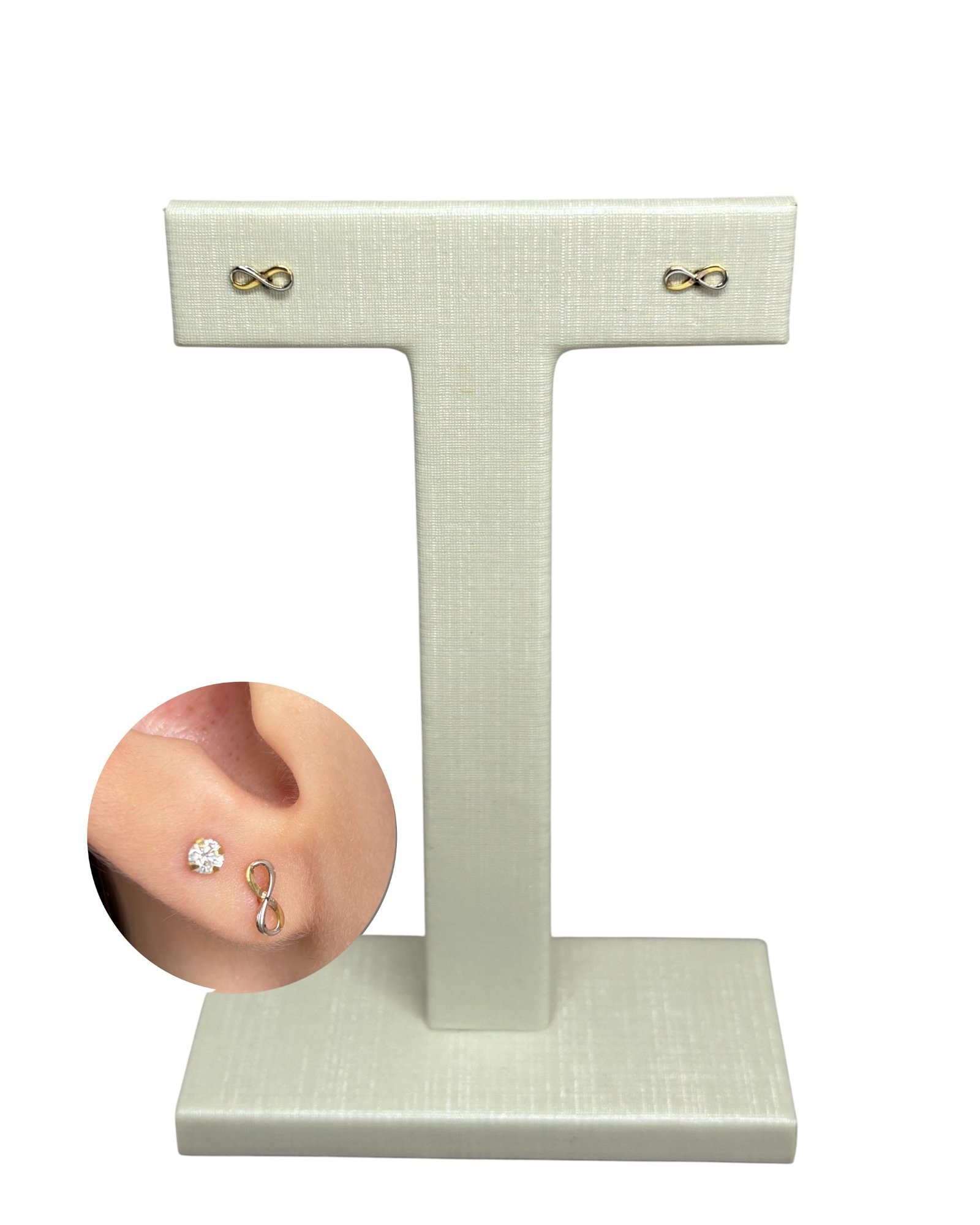 Brinco infinito vazado em ouro amarelo 18k e ouro branco.