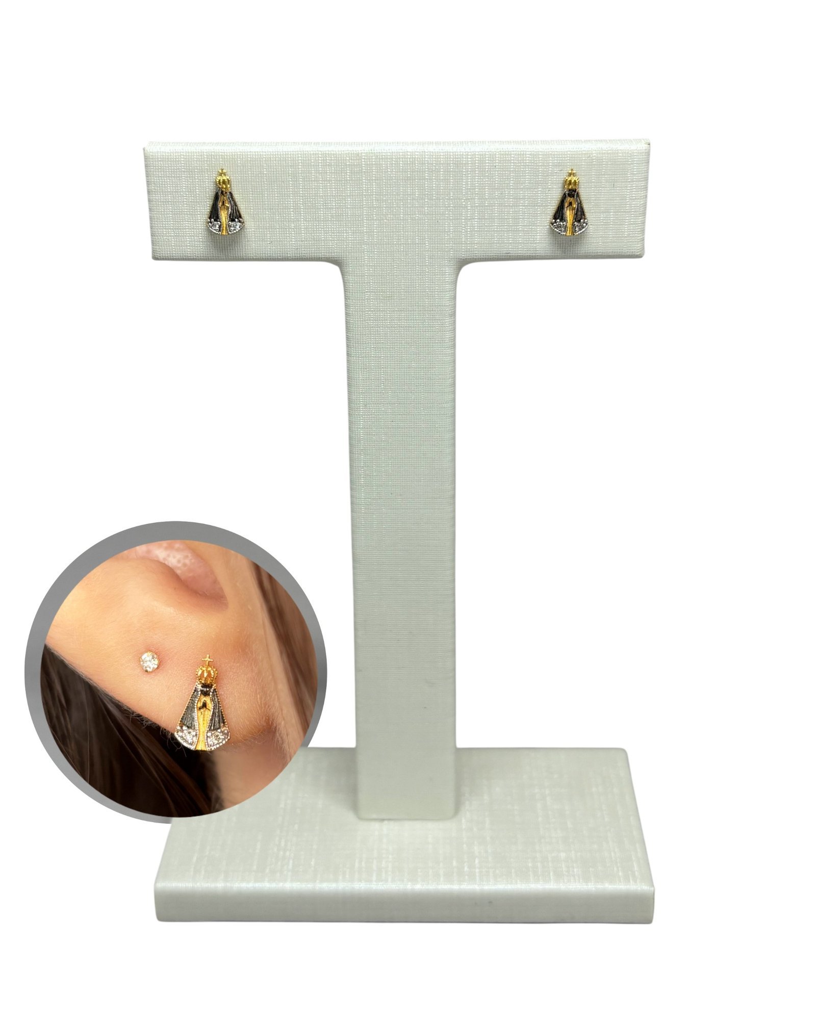 Brinco Nossa Senhora Aparecida em ouro 18k com zircônias.