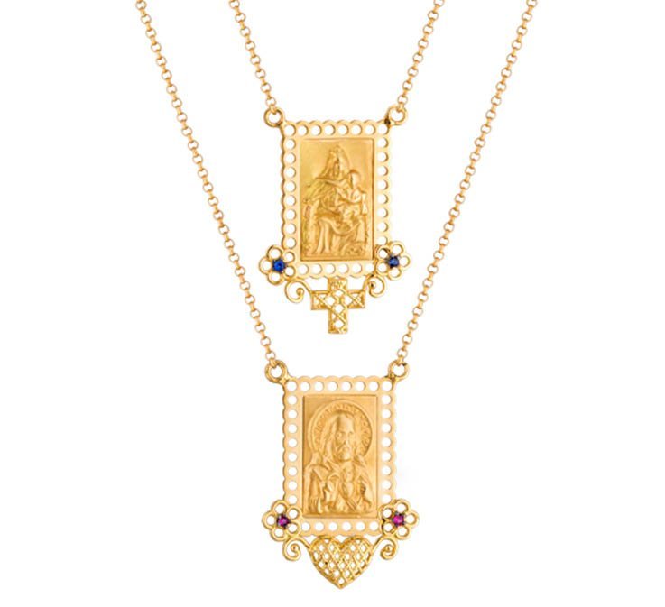 Escapulário corrente portuguesa de 60cm com placas M dupla face em ouro 18k com 2 rubis e 2 safiras.