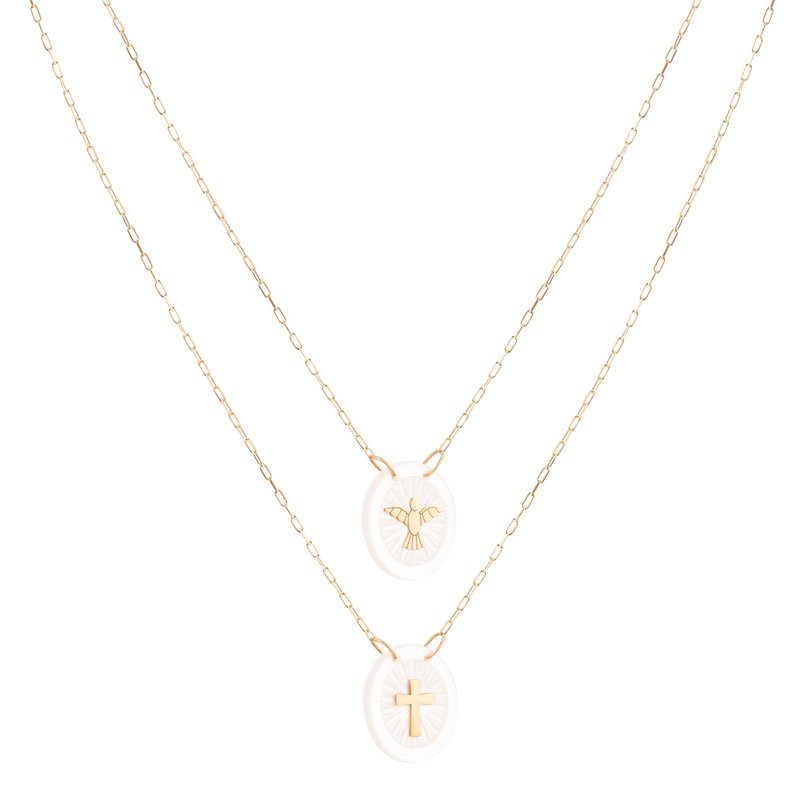 Escapulário cruz e Espírito Santo medindo 60cm em ouro 18k com corações de madrepérolas.