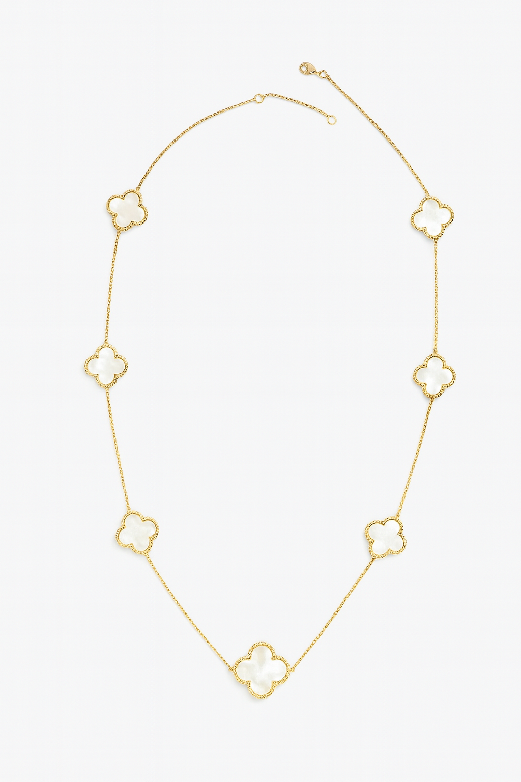 Gargantilha de 40/45cm em ouro 18k com 7 trevos em madrepérola.