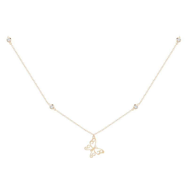 Gargantilha borboleta vazada com corrente cadeado de 45cm em ouro 18k e topázio branco.