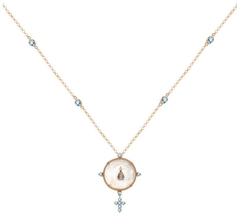 Gargantilha Nossa Senhora Aparecida com corrente elo português de 45cm com cristal e topázios sky.