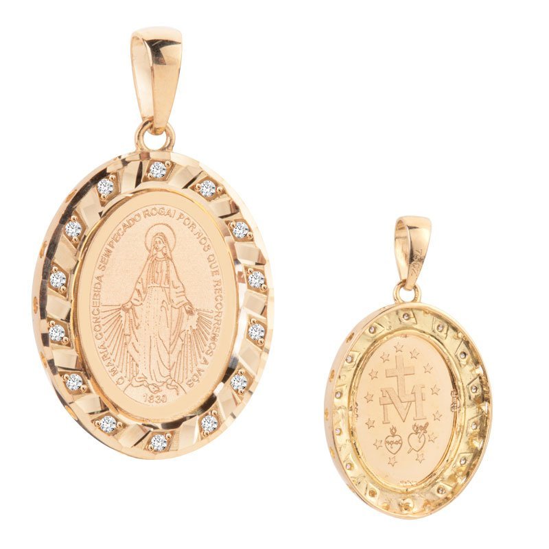 Medalha Nossa Senhora das Graças em ouro 18k com zircônias.