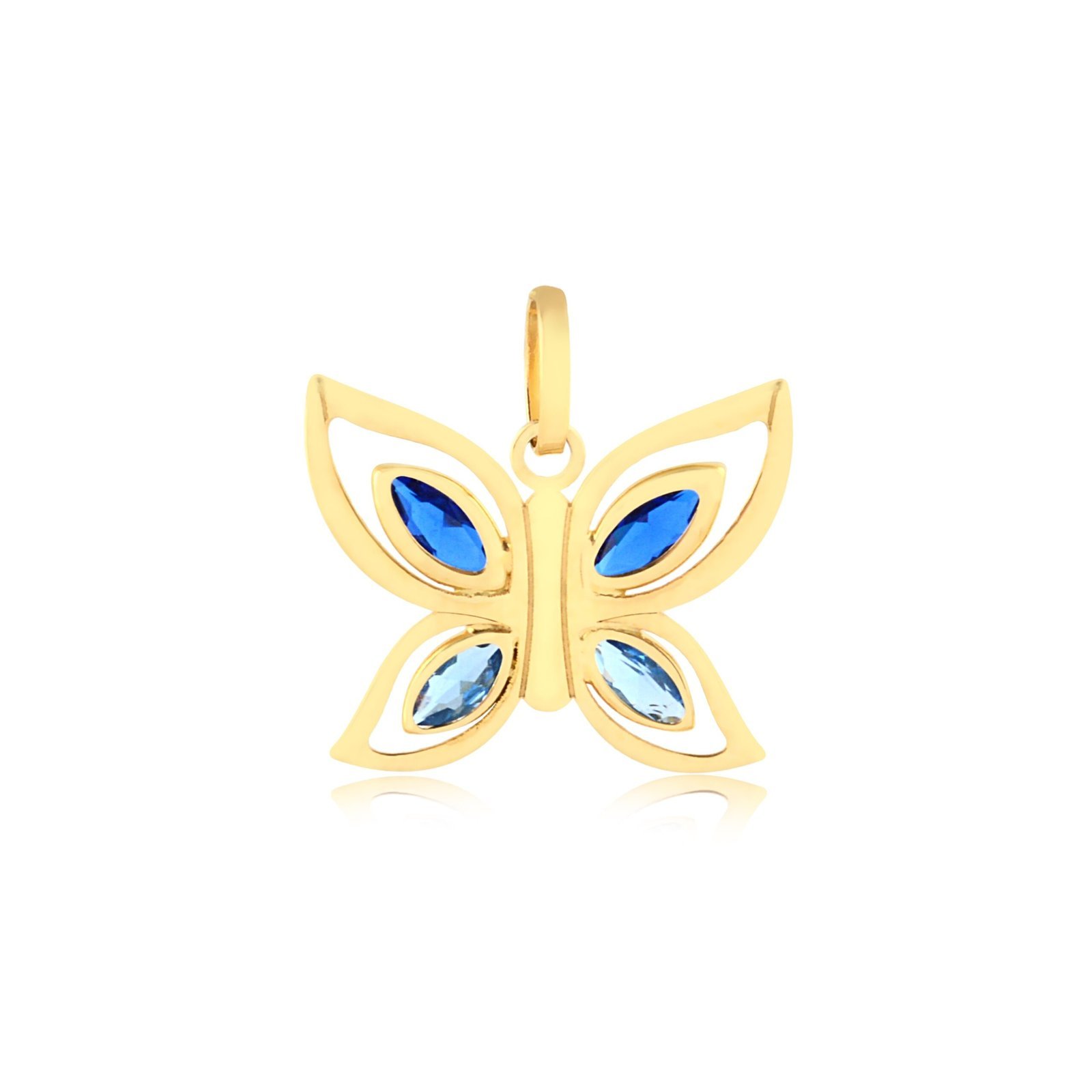 Pingente Borboleta em ouro amarelo 18k. Altura: 15 mm. Com 4 zircônias.