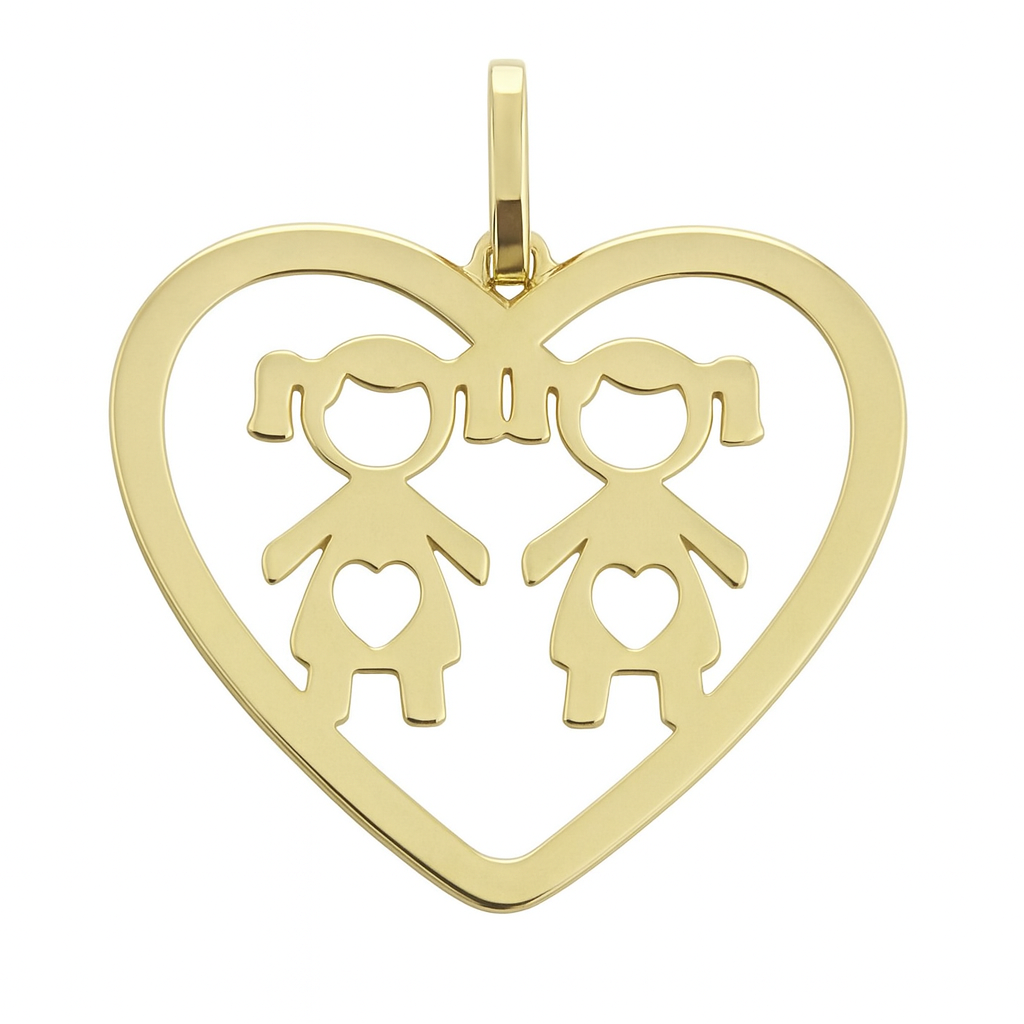 Pingente coração vazado com duas meninas em ouro 18k.