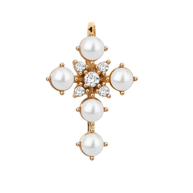 Pingente cruz em ouro 18k com pérolas e zircônias.