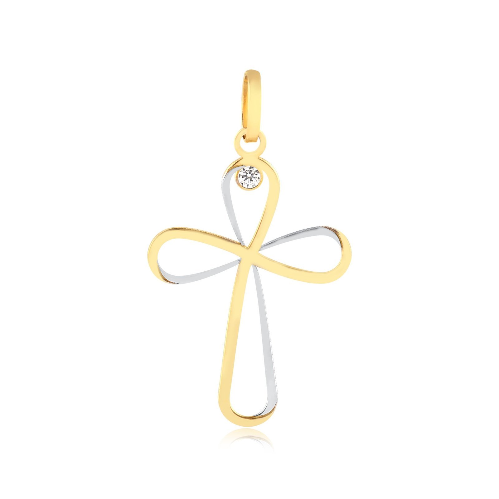 Pingente cruz infinito vazado em ouro amarelo 18k e ouro branco com 1 zircônia.