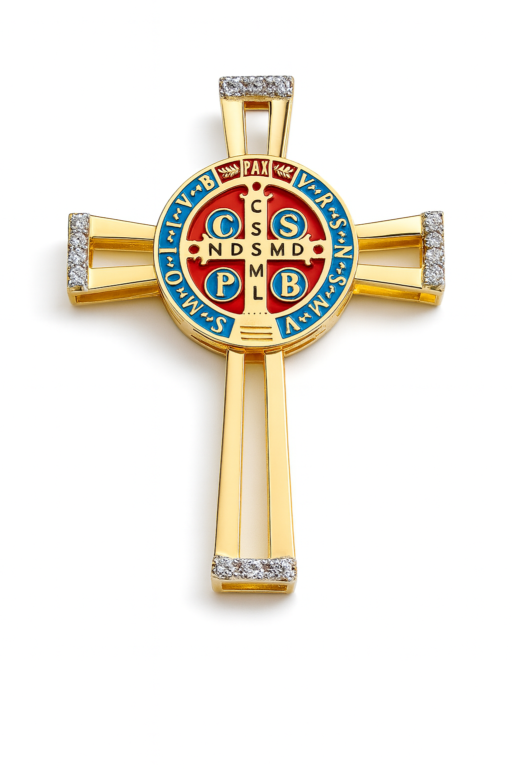Pingente cruz São Bento esmaltado com 20 topázios brancos