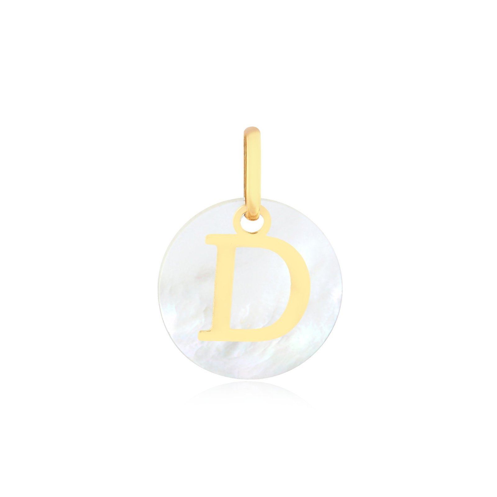 Pingente letra D em ouro 18k com madrepérola de 12mm de diâmetro.
