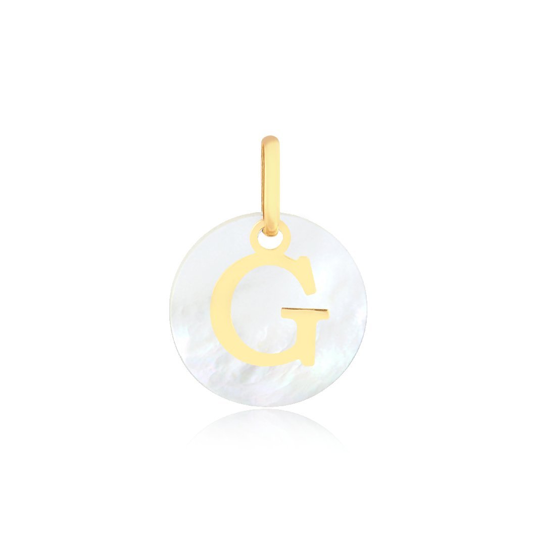 Pingente letra G em ouro 18k com madrepérola de 12mm de diâmetro.