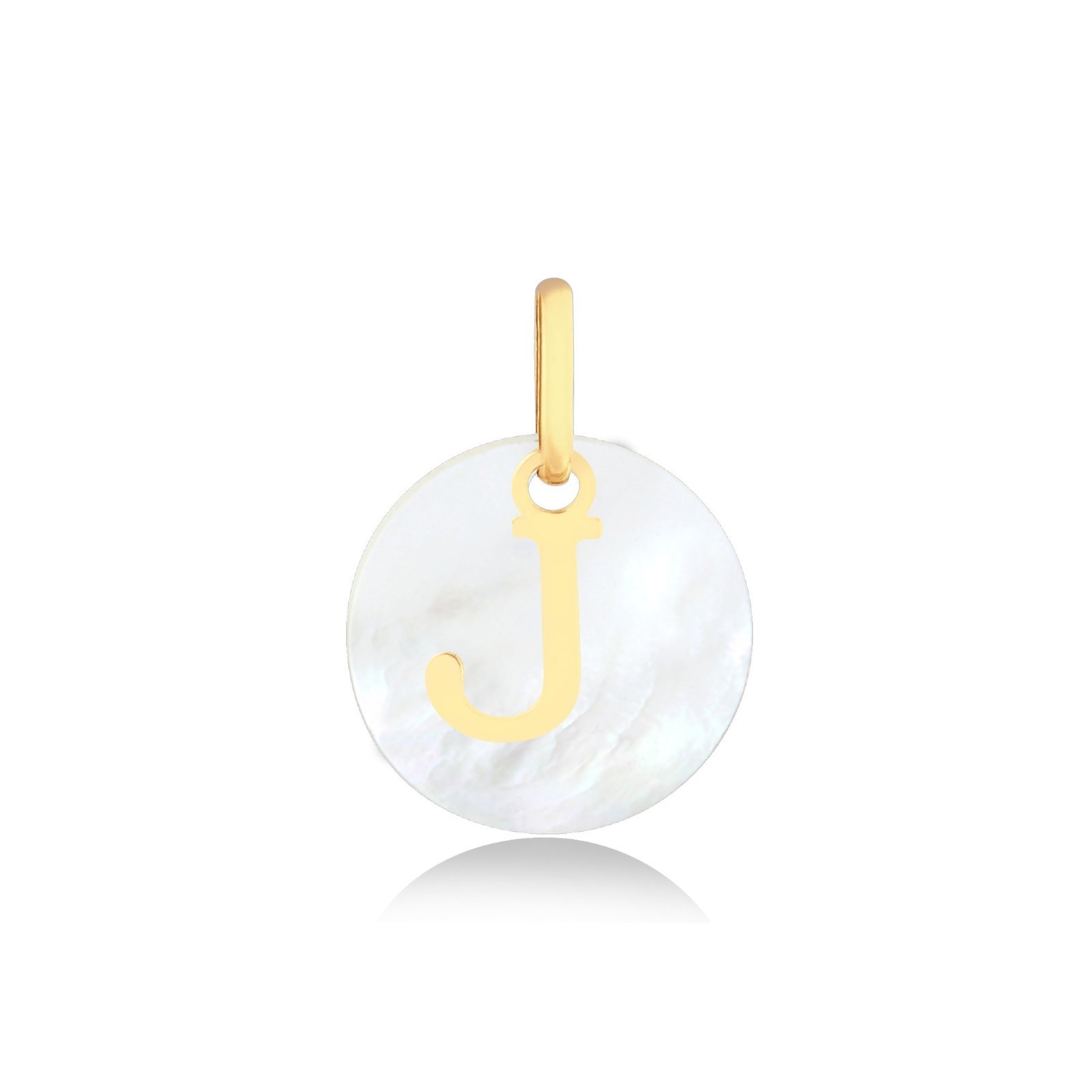 Pingente letra J em ouro 18k com madrepérola de 12mm de diâmetro.
