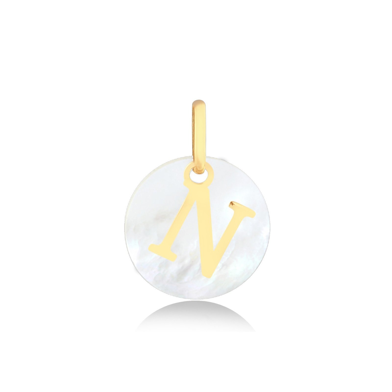 Pingente letra N em ouro 18k com madrepérola de 12mm de diâmetro.