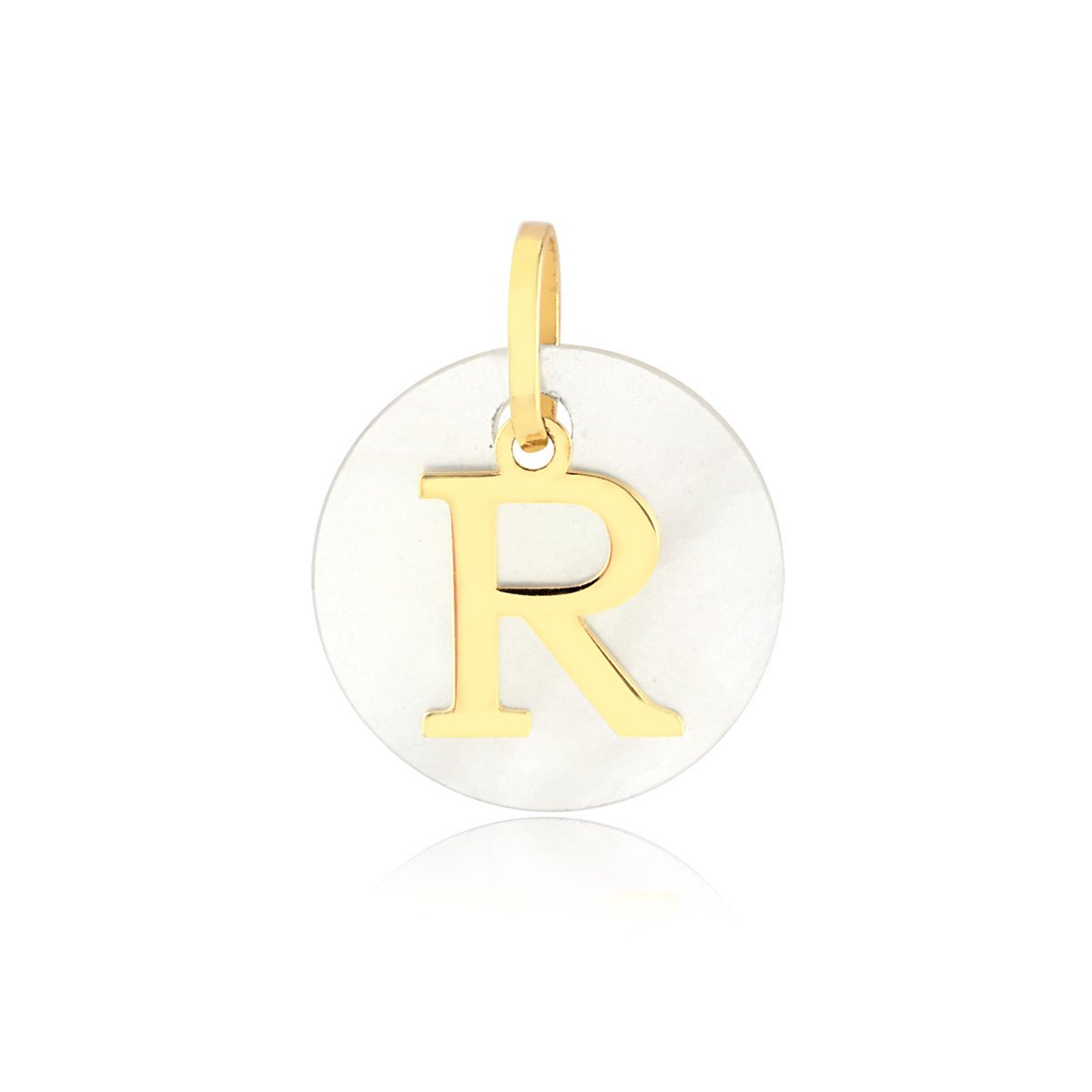 Pingente letra R em ouro 18k com madrepérola de 12mm de diâmetro.