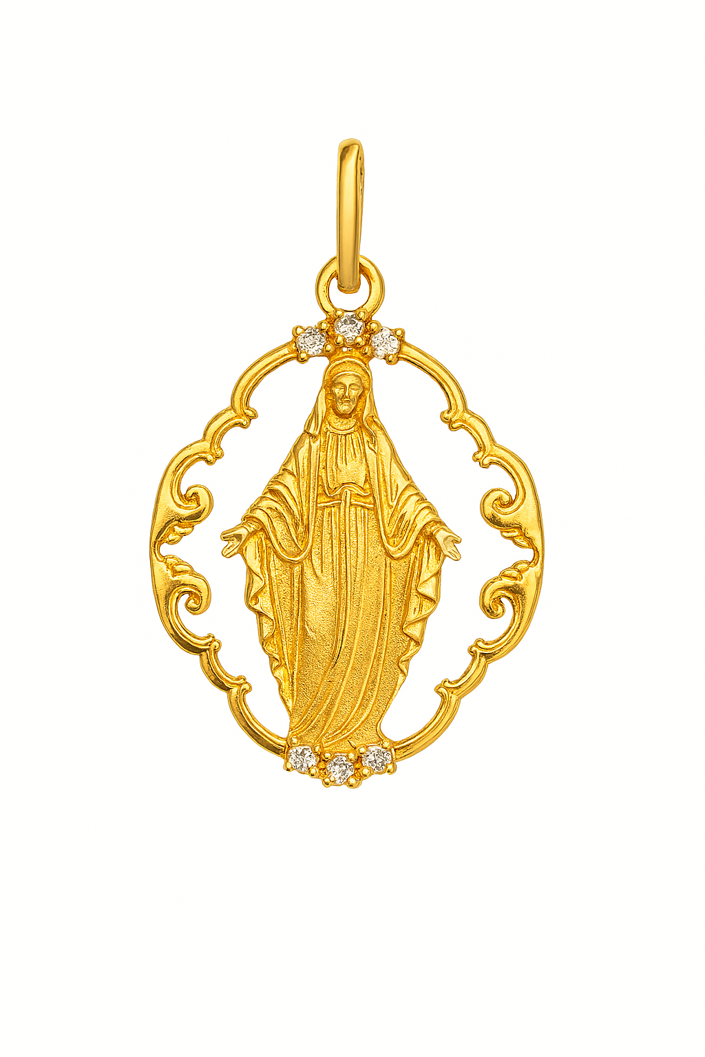 Pingente Nossa Senhora das Graças em ouro 18k com 6 brilhantes.