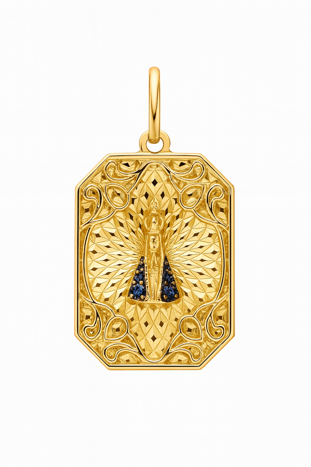 Pingente Nossa Senhora Aparecida em ouro 18k com 6 safiras.
