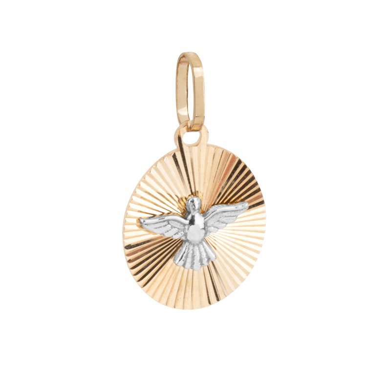 Pingente medalha oval com Espírito Santo em ouro amarelo 18k e ouro branco.