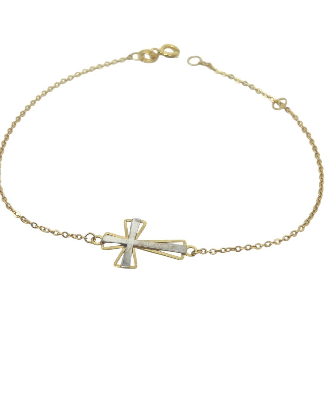 Pulseira bailarina de 18cm com cruz em ouro amarelo 18k e ouro branco.