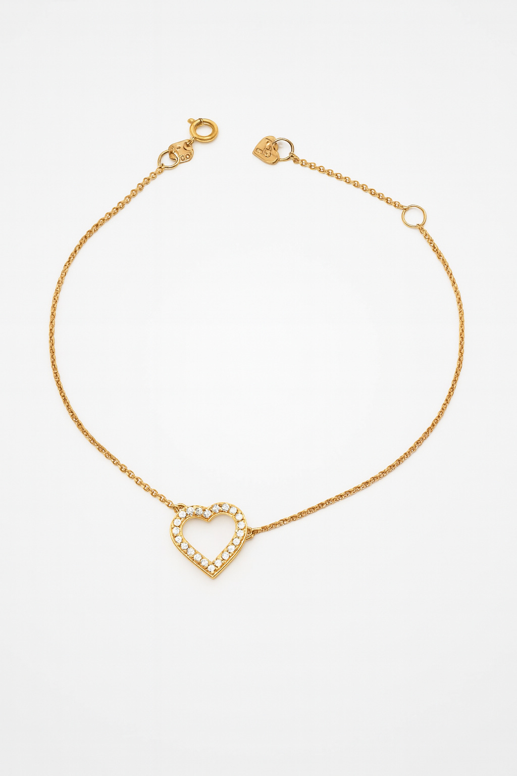 Pulseira coração galeria vazado de 19cm em ouro 18k com zircônias.