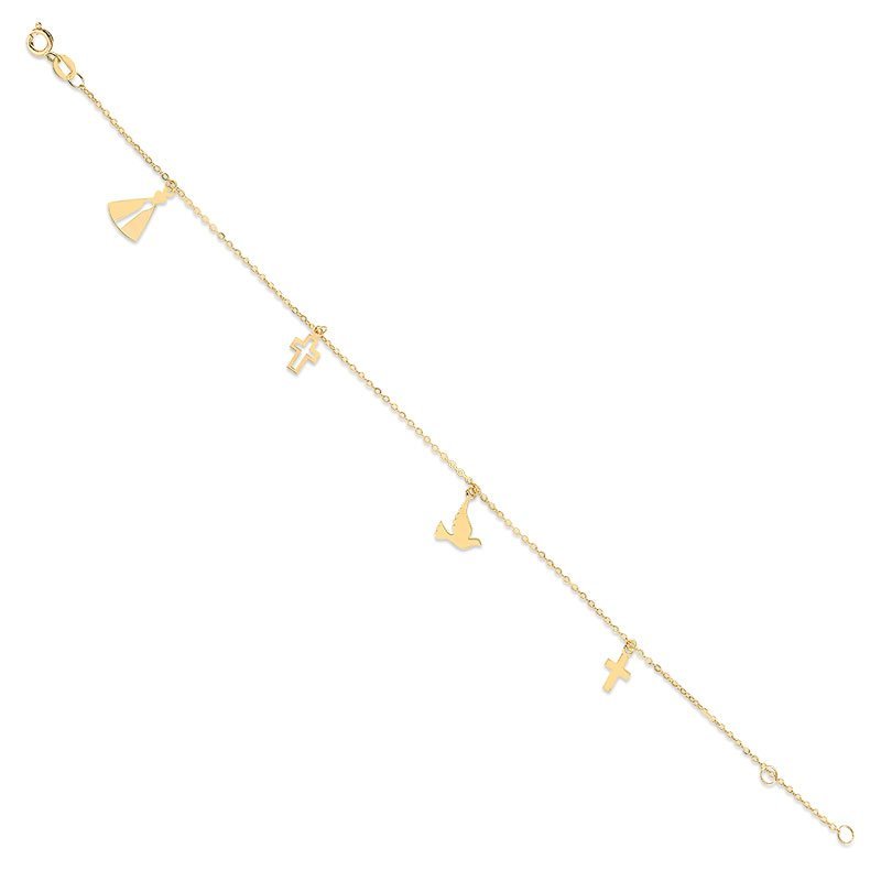 Pulseira cadeado de 15cm com Nossa Senhora Aparecida, Cruz e Espírito Santo em ouro 18k.
